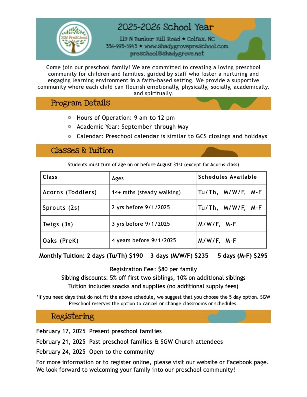 To inquire about registration or a tour, please email the Director at preschool@shadygrove.net or use our contact form. Registration is completed onine. Check back here for the link or our Facebook page.